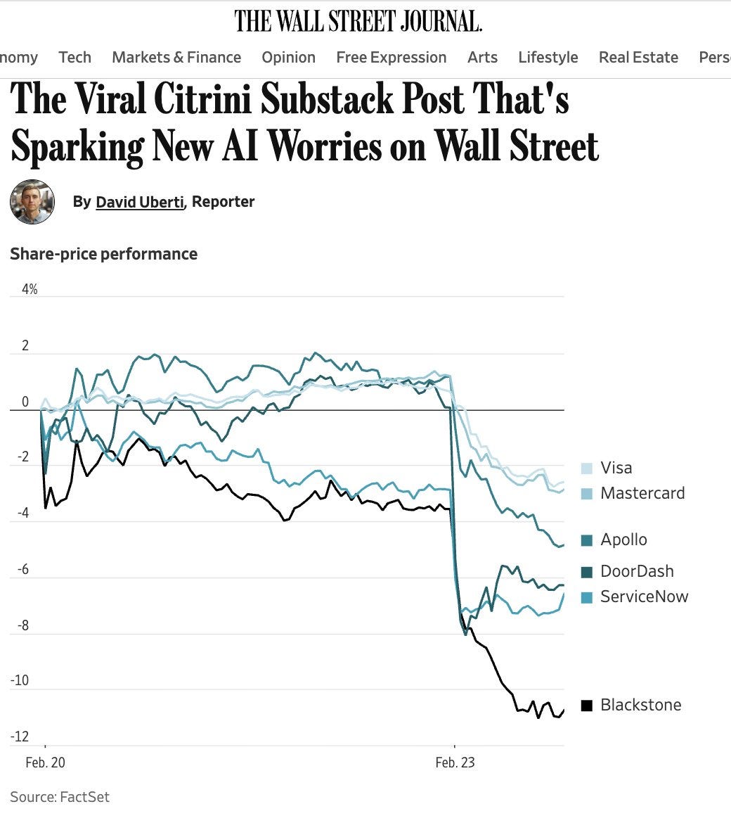 This post has gone viral. It’s a fictional post about the future if AI takes over all white color jobs. While fictional, it impacted the stock market today.