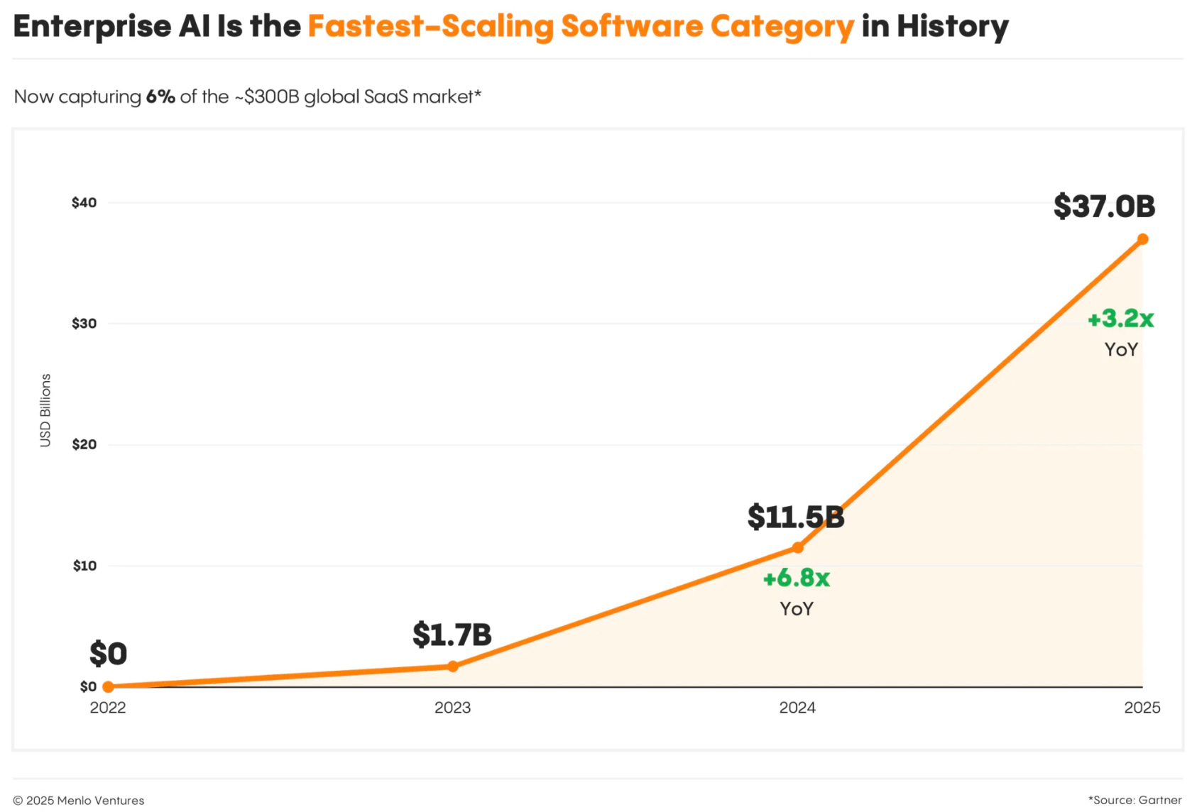 Market scale and momentum. Enterprise AI spend hit $37 billion in 2025, up 3.2x from $11.5 billion in 2024. The application layer captured $19 billion of that total. 🤯