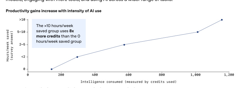 The more “intensely” you use AI, the more productivity you gain. (Self-serving reporting?)