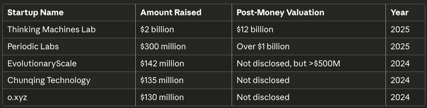 The top five largest seed investment valuations ever recorded are dominated by recent AI startups, with sizes and valuations that far outpace historical norms.