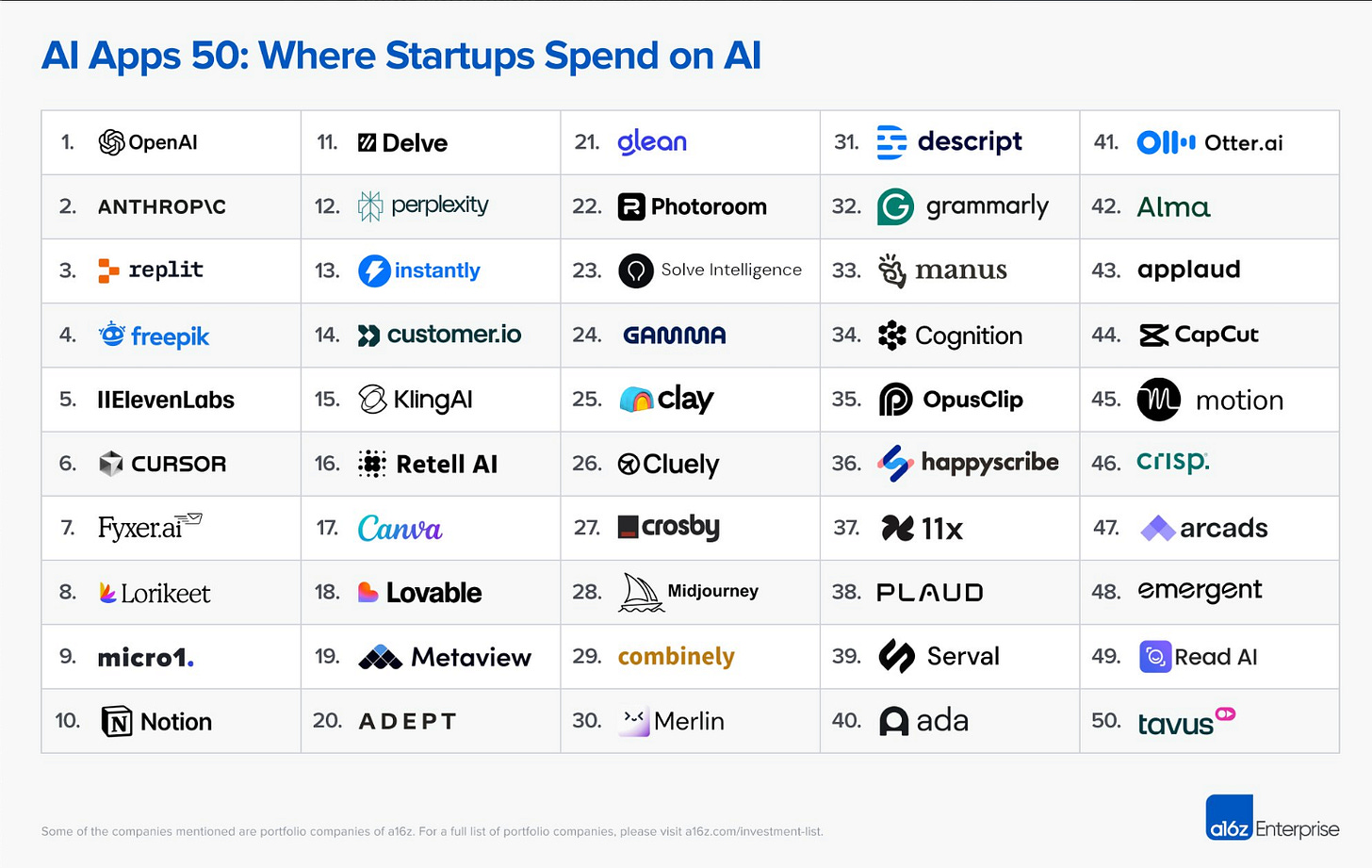 A16z released a top 50 list of AI products that startups spend on.