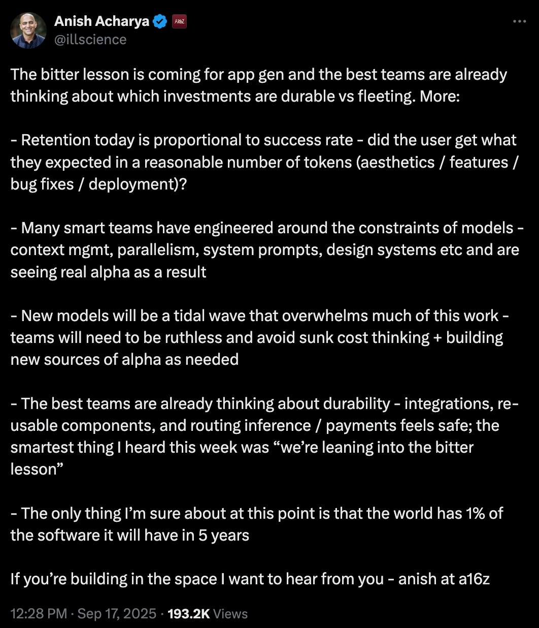 Anish Acharya from A16z had this to say about the challenges facing “AI App Gen” companies: