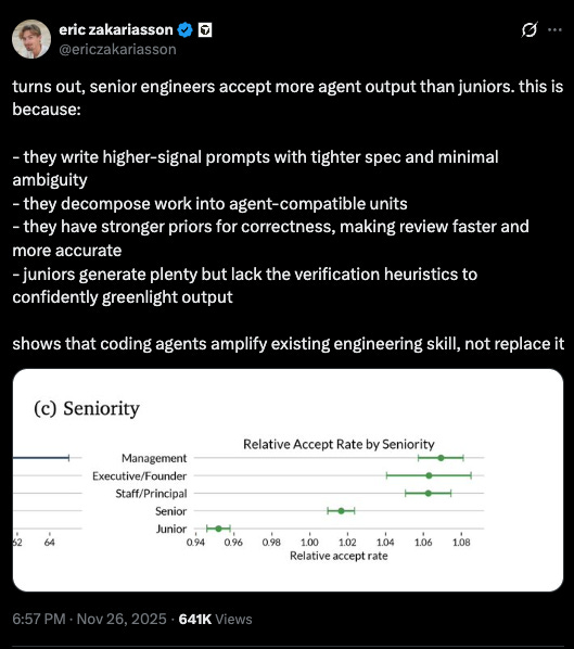 Research shows that engineering seniority is correlated to agent code accepts. While I can see this, I also buy the comment below 🤣
